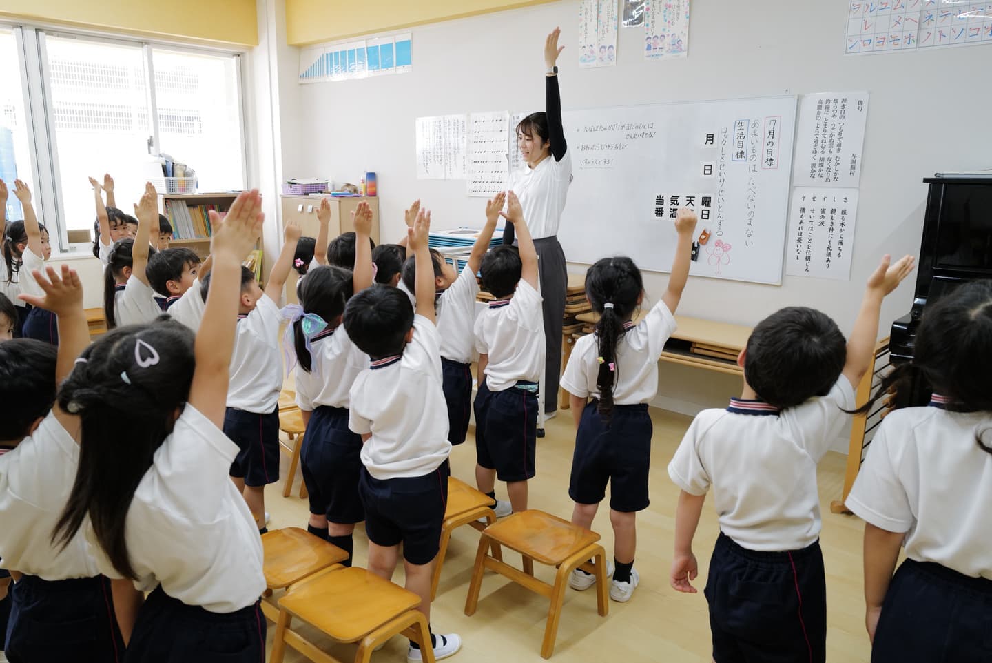 言語あそびは、体育あそびで脳内の血流が促された後、各教室で明るく楽しくテンポよく進められます。子どもたちは本能としてあふれんばかりの知的好奇心に満ちています。大人の押しつけではなく、子どもたちが主体的に参加する楽しい「あそび」として取り組みます。集団活動と個人活動をバランス良く取り入れ、集中力、思考力、判断力などの心身の発達を総合的に促します。
