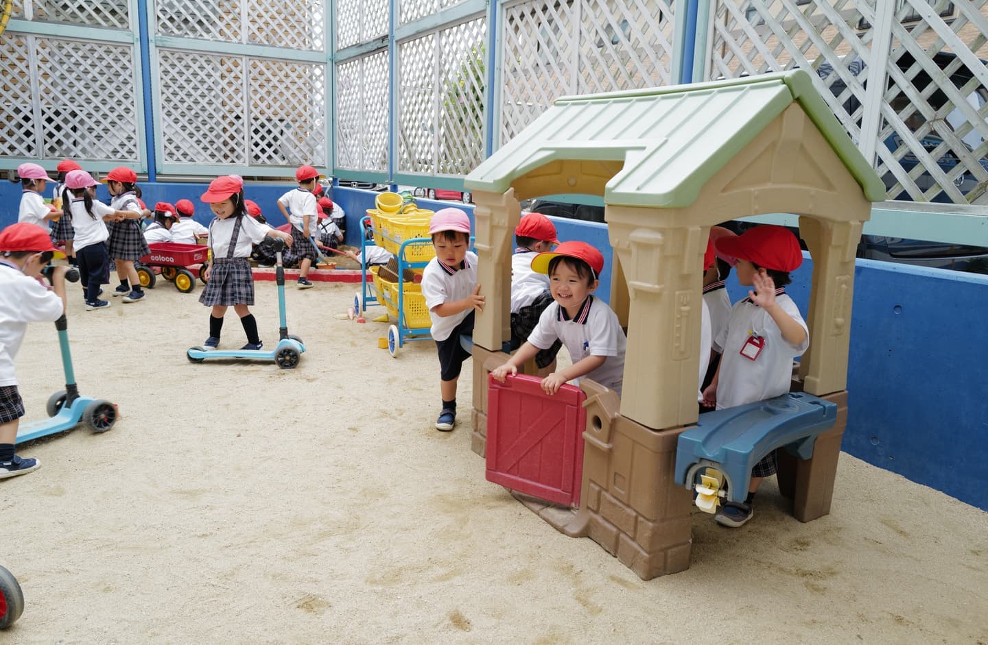 身じたく後、室内で絵本や自由画、ブロック、積み木など、園庭では乗り物、ブランコ、シーソー、サッカー、鬼ごっこなどをして自由に遊びます。