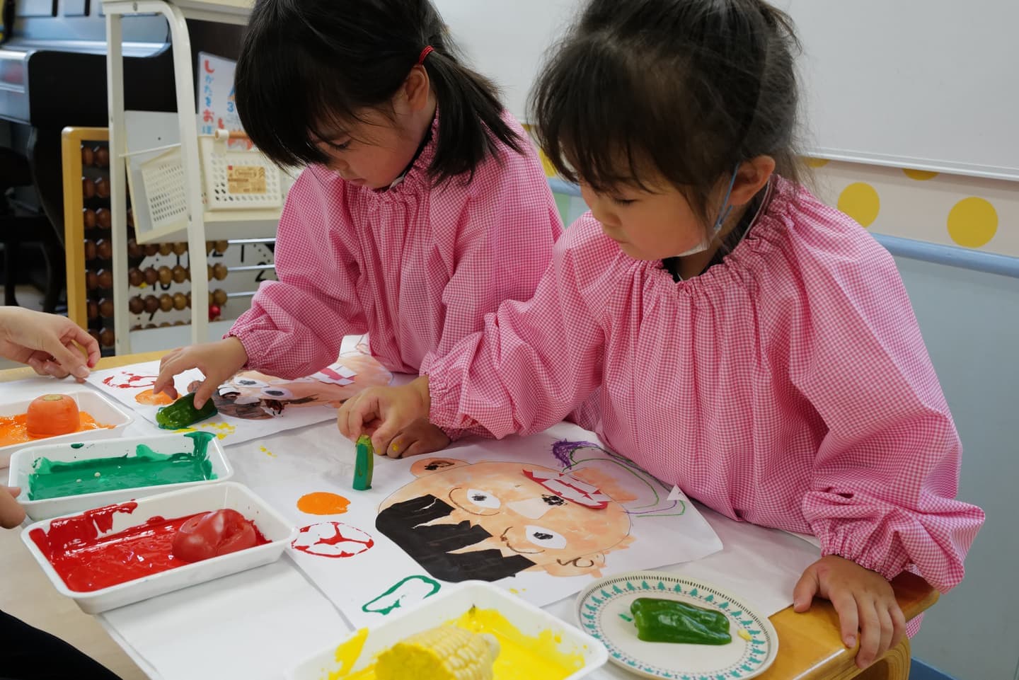創作あそび、生活・道徳、合同のうた、ホームルームなど季節に応じて学年ごとのプログラムを展開します。(年少組コラージュと野菜スタンプ)