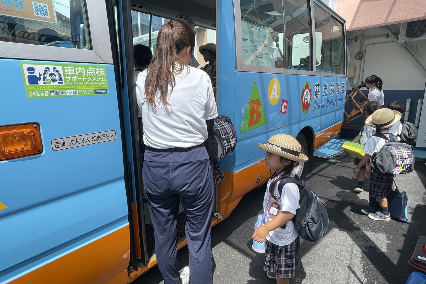 スクールバス、ドライブスルー(正門の前で乗車)、各自送迎で安全に降園します。バスには車内点検サポートシステムが搭載されています。
