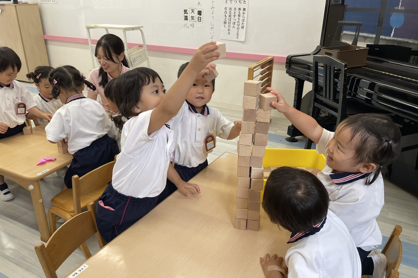 学年の時間割に応じたバランスプログラム。つみき、ひも通し、鍵盤ハーモニカ、チューター、プリント、書写、作文や創作あそびを行います。