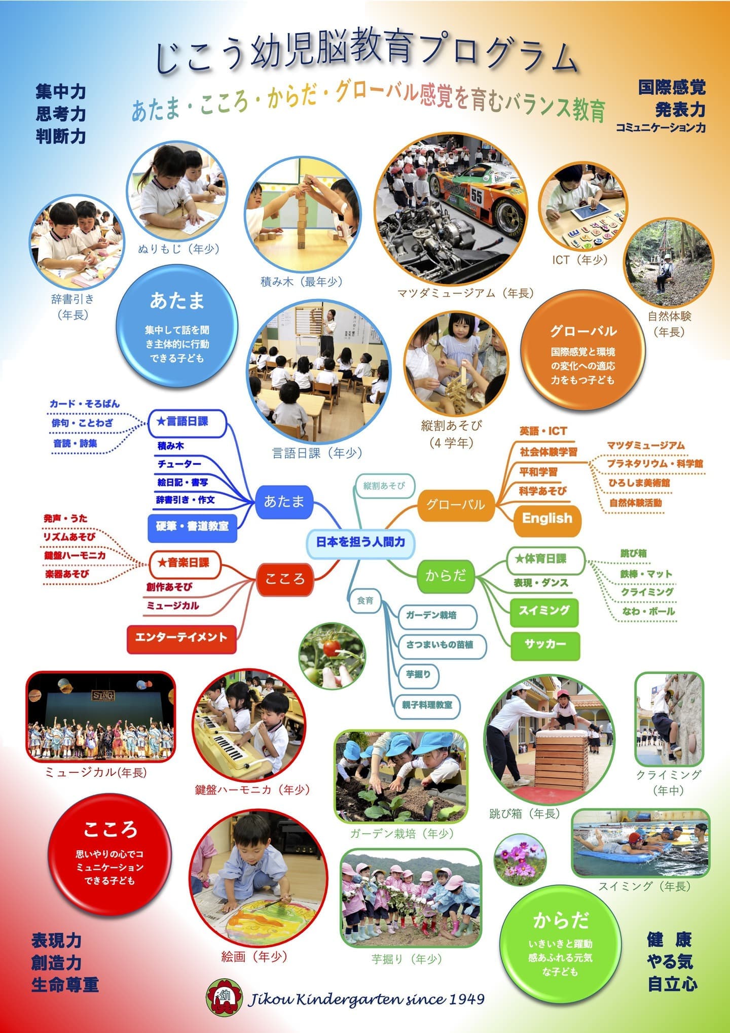 ICTあそび(かず、英語、タングラム、プログラミングなど) - 社会体験学習(マツダミュージアム、ひろしま美術館、江波山気象館、広島市森林公園など)